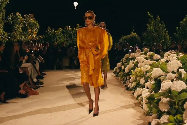 في أجواء سينمائية، تكون امرأة سان لوران بطلة وكلاسيكية في آن واحد، فريدة ومتعددة الأوجه." يأتي ظهورها بعد أيام قليلة من رؤيتها في شوارع باريس بإطلالة أنيقة وعصرية مرتديةً معطفًا بنيًا ونظارة شمسية بيضاوية سوداء وتحمل حقيبة كوتش.