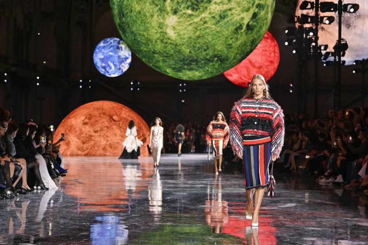 لم يكن المشهد مجرد عرض جديد، بل كان أشبه بنظام شمسي كامل، مع كواكب مضيئة معلّقة في الأعلى وأخرى على الأرض، تزيّن الأرضية السوداء اللامعة. على عكس كارل لاغرفيلد المعروف بأسلوبه الملفت وتسريحته البيضاء وربطة عنقه السوداء، يظهر بليزي بأسلوب هادئ وبسيط عبارة عن جينز وتيشيرت، لكن حضوره يظل مؤثرًا.