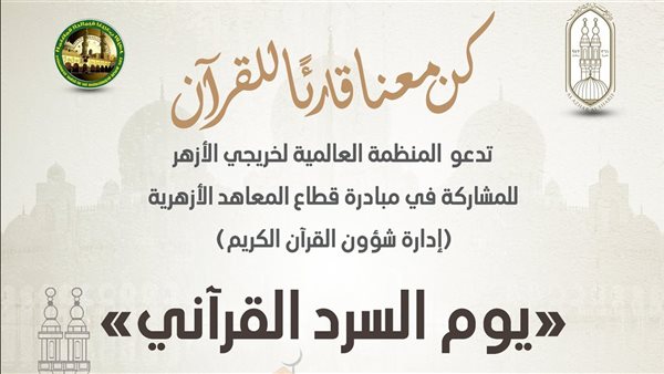 بمشاركة عشرات الآلاف داخل مصر وخارجها، تستعد الإدارة العامة لشئون القرآن الكريم بالأزهر الشريف، لإطلاق النسخة العالمية الثانية من مبادرة "اليوم العالمي للسرد القرآني"، وهو اليوم الذي خصصه الأزهر الشريف للسرد القرآني، الذي سيقام يوم 30 أغسطس، من كل عام، وذلك برعاية كريمة من فضيلة الإمام الأكبر الأستاذ الدكتور أحمد الطيب، شيخ الأزهر الشريف، ليكون احتفالًا عالميًا بتلاوة القرآن الكريم.