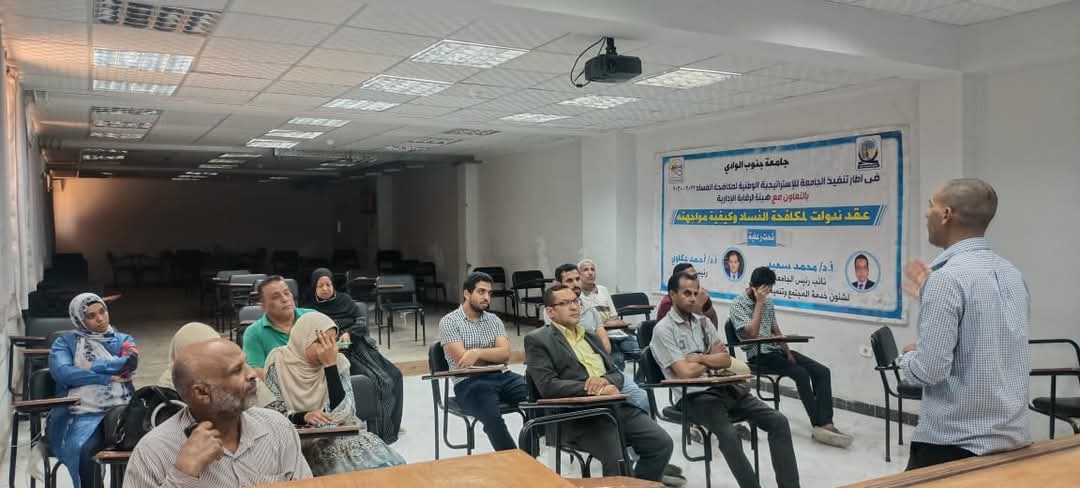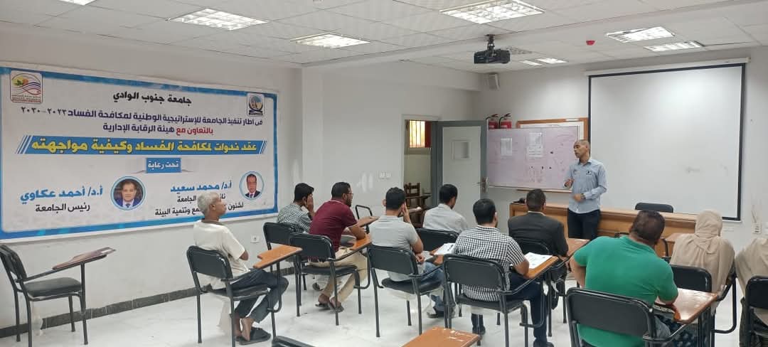 تناولت الندوة تعريف الفساد وأنواعه وأسبابه ووسائل مجابهته ودور الأجهزة الرقابية الوطنية في مكافحة الفساد ، والإطار المؤسسي لمكافحة الفساد بجمهور مصر العربية وعرض استراتيجيات مكافحة الفساد ، قام بتنسيق الندوة احمد بسام القاضي مدير إدارة المؤتمرات بالجامعة، وذلك تحت رعاية الدكتور أحمد عكاوي رئيس جامعة جنوب الوادي والدكتور محمد سعيد نائب رئيس الجامعة لشئون خدمة المجتمع وتنمية البيئة.