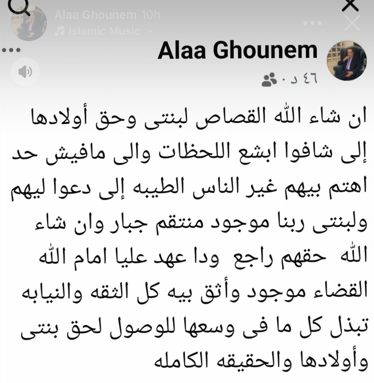 وجاء ذلك عبر بوست نشره على صفحته بمنصة "الفيس بوك" قائلًا :أن شاء الله القصاص لبنتي وحق أولادها إلي شافوا ابشع اللحظات والى مافيش حد اهتم بيهم غير الناس الطيبه إلى دعوا ليهم ولبنتي ربنا موجود منتقم جبار وإن شاء الله حقهم راجع ودا عهد عليا امام الله القضاء موجود وأثق بيه كل الثقه والنيابة تبذل كل مافي وسعها للوصول لحق بنتي وأولادها والحقيقة الكاملة.