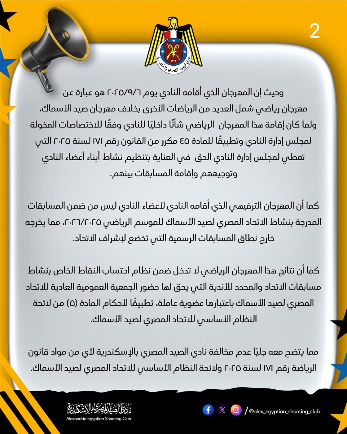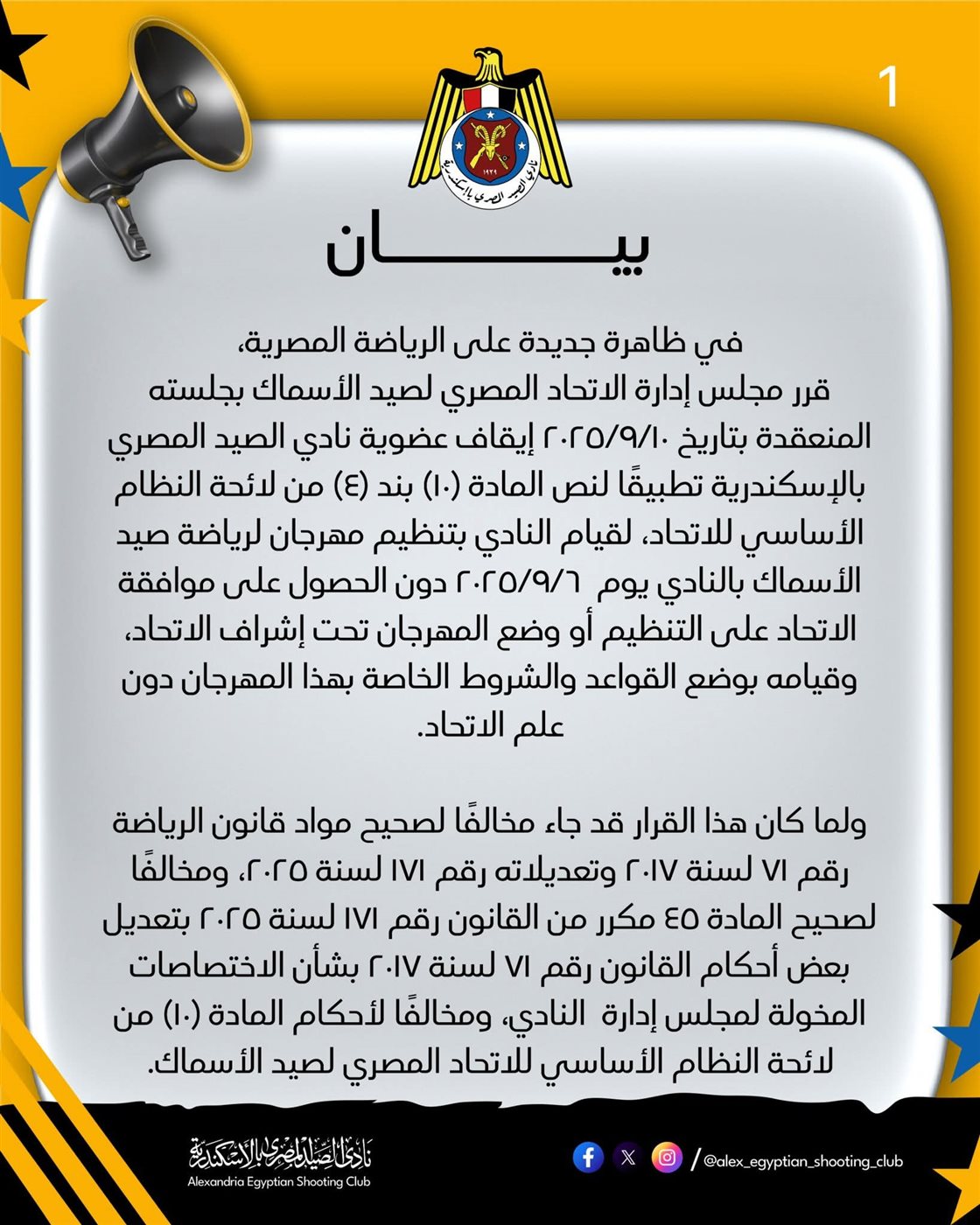 أصدر نادي الصيد المصري بالإسكندرية بيانًا رسميًا أعرب فيه عن رفضه التام للقرار الصادر من الاتحاد المصري لصيد الأسماك بإيقاف عضويته، مؤكدًا أن القرار جاء دون أي سند قانوني، ومخالفًا لصحيح مواد قانون الرياضة رقم 71 لسنة 2017 وتعديلاته رقم 171 لسنة 2025، ولائحة النظام الأساسي للاتحاد المصري لصيد الأسماك، ولاسيما المادة 45 مكرر التي تمنح مجلس إدارة النادي الحق في تنظيم النشاط الرياضي لأعضاء النادي وإقامة المسابقات والفعاليات المختلفة.
