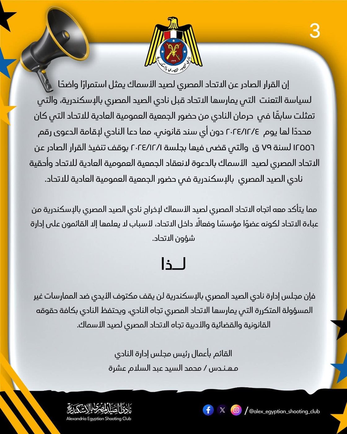 وفي ختام البيان، شدد نادي الصيد المصري بالإسكندرية على أن نشاطاته الداخلية، بما فيها المهرجانات والفعاليات الرياضية لأعضاء النادي، ستستمر وفق اللوائح القانونية، وأنه سيظل من الأندية الرائدة في دعم الرياضة وتقديم الفعاليات التي تعود بالنفع على أعضائه دون أي تدخل غير قانوني من الاتحاد.
