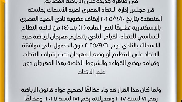 وأشار البيان، إلى أن سبب إيقاف العضوية هو إقامة النادي مهرجان رياضي يوم 6 سبتمبر 2025، تضمن نشاطات متعددة، منها رياضة صيد الأسماك وأنشطة ترفيهية ورياضية أخرى، دون الحصول على موافقة الاتحاد، ووضع قواعد وشروط المهرجان الخاصة بالنادي.