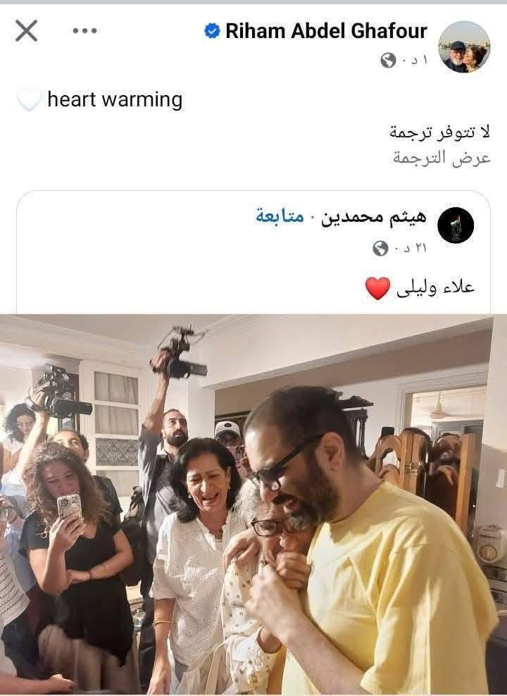 وتفاعلت الفنانة ريهام عبد الغفور مع خبر الإفراج عن علاء عبد الفتاح، ونشرت صورة له مع والدته وعلقت قائلة: ربنا ما يوجع قلب أي أم على أولادها.