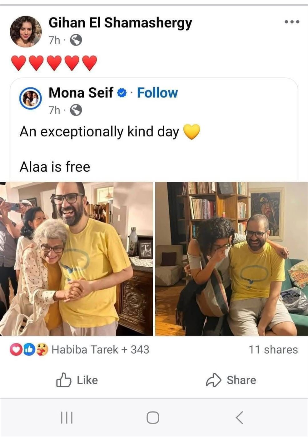 ومن جانبها احتفلت الفنانة جيهان الشماشرجي بخروج علاء عبد الفتاح وشاركت صوره من داخل منزله، وعلقت بقلوب تعبريا عن سعادتها.