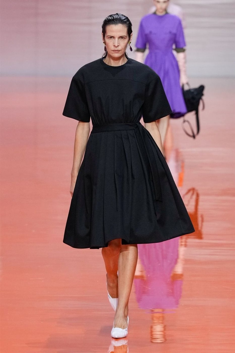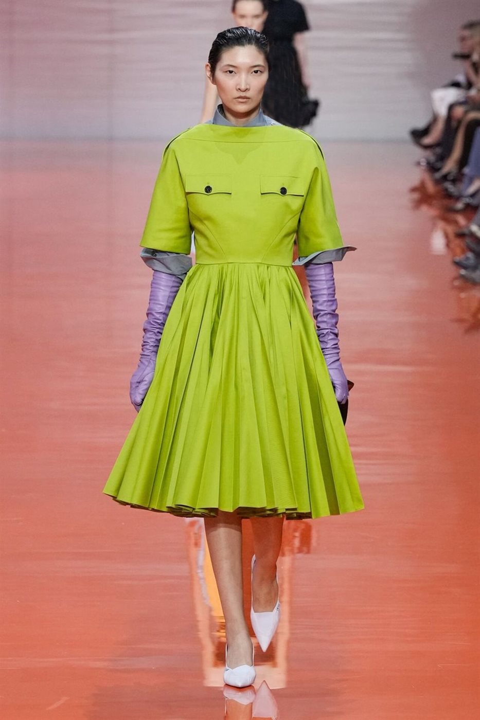 وجاءت مُزينة بأشرطة أنيقة. بينما صُممت الفساتين ذات الياقات المرصعة بالجواهر بسهولة خالفت طابعها الرسمي الأصيل، فيما خَففت من حدته الملابس الخارجية، وأوحى هذا المزيج برفض التسلسلات الهرمية الثابتة لصالح الانسيابية والتجريب.
