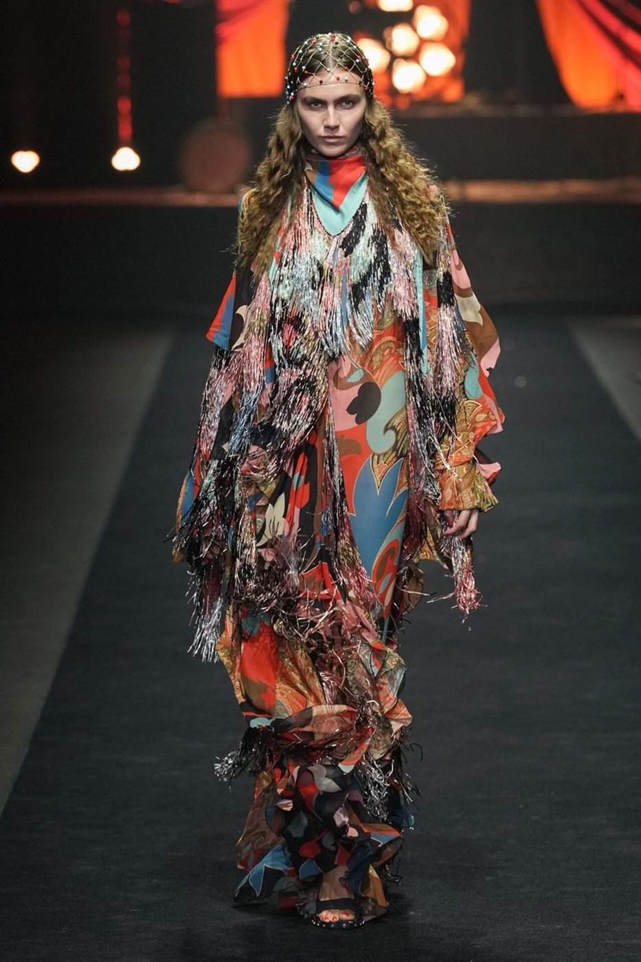 وقدمت المجموعة عدداً من الفساتين الناعمة والواسعة بطبعات سايكدلية (تحفز هورمون السعادة) تقاسمت الساحة مع سترات مصممة بدقة، وقمصان ريدينغوت، وأزياء مستوحاة من موسيقى الروك.
