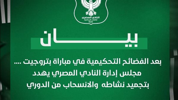 وأضاف بيان النادي انه لذلك فإن مجلس إدارة النادي المصري في حالة انعقاد دائم اعتبارا من الآن لدراسة اتخاذ العديد من القرارات التصعيدية والتي قد تصل إلى تجميد نشاطه الرياضي والانسحاب من بطولة الدوري خاصة في ظل انعدام مبدأ تكافؤ الفرص والمنافسة الشريفة التي بات التحكيم المصري.