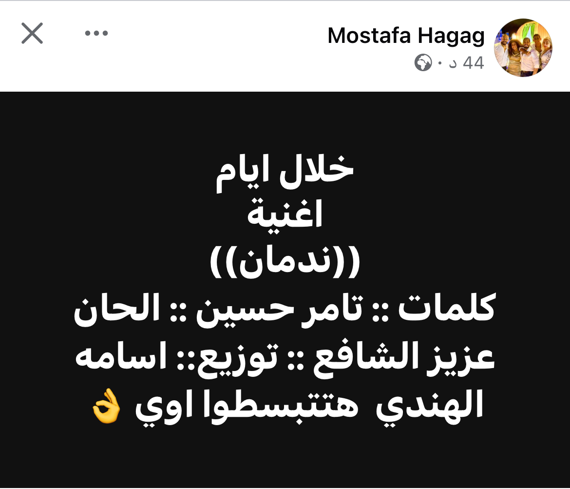 وكتب مصطفى حجاج : خلال أيام أغنية “ ندمان” كلمات تامر حسبن .. ألحان عزيز الشافعي .. توزيع أسامة الهندي .. هتتبسطوا أوي .