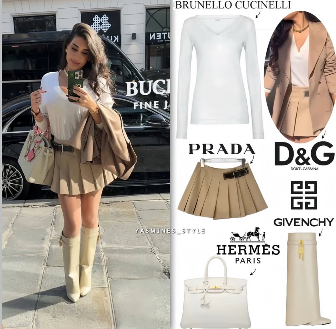ارتدت الفنانة ياسمين صبري، إطلالة فاخرة حملت توقيع أشهر وأكبر العلامات التجارية العالمية، فيما ارتدت بليزر من اللون البيج من توقيع علامة دولتشي أند غابانا، فيما نسقت البدلة مع تنورة قصيرك بليسيه من نفس اللون بتوقيع برادا.