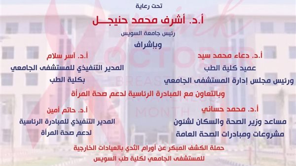 برعاية أ.د. أشرف حنفل، رئيس جامعة السويس، وتحت إشراف أ.د. دعاء محمد سيد، عميد كلية الطب، وأ.د. آسر عبدالحي سلام، وكيل الكلية والمدير التنفيذي للمستشفى الجامعي، تعلن المستشفى عن حملة الكشف المبكر عن أورام الثدي، بالتعاون مع المبادرة الرئاسية لدعم صحة المرأة وهيئة الرعاية الصحية بالسويس.