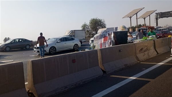 تصادم سيارة نقل بالحاجز الخرساني يعطل الحركة على طريق بنها الحر بالقليوبية