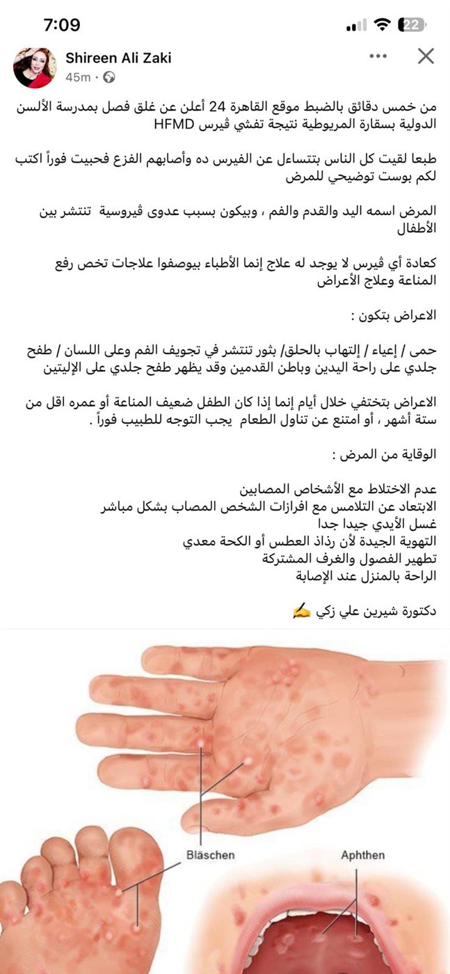 قالت الدكتورة شيرين علي زكي، رئيس لجنة سلامة الغذاء والمتابعة الميدانية بالنقابة العامة للأطباء البيطريين، إن أحد المواقع الإخبارية أعلن منذ خمس دقائق عن غلق فصل بمدرسة الألسن الدولية بسطارة المريوطية نتيجة تفشي فيروس HFMD.