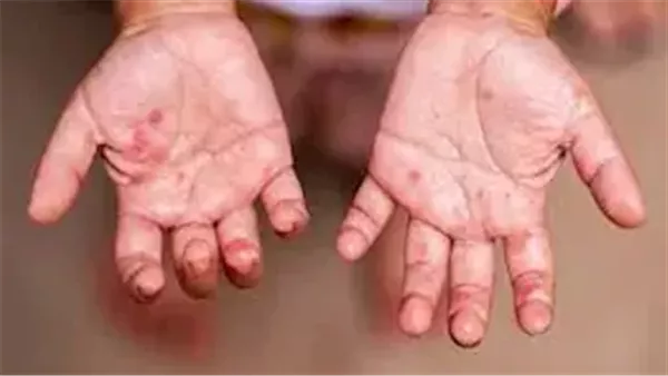 طفح جلدي: يظهر على اليدين والقدمين، وقد يمتد إلى مناطق أخرى مثل الأرداف، وتتكون من بثور.