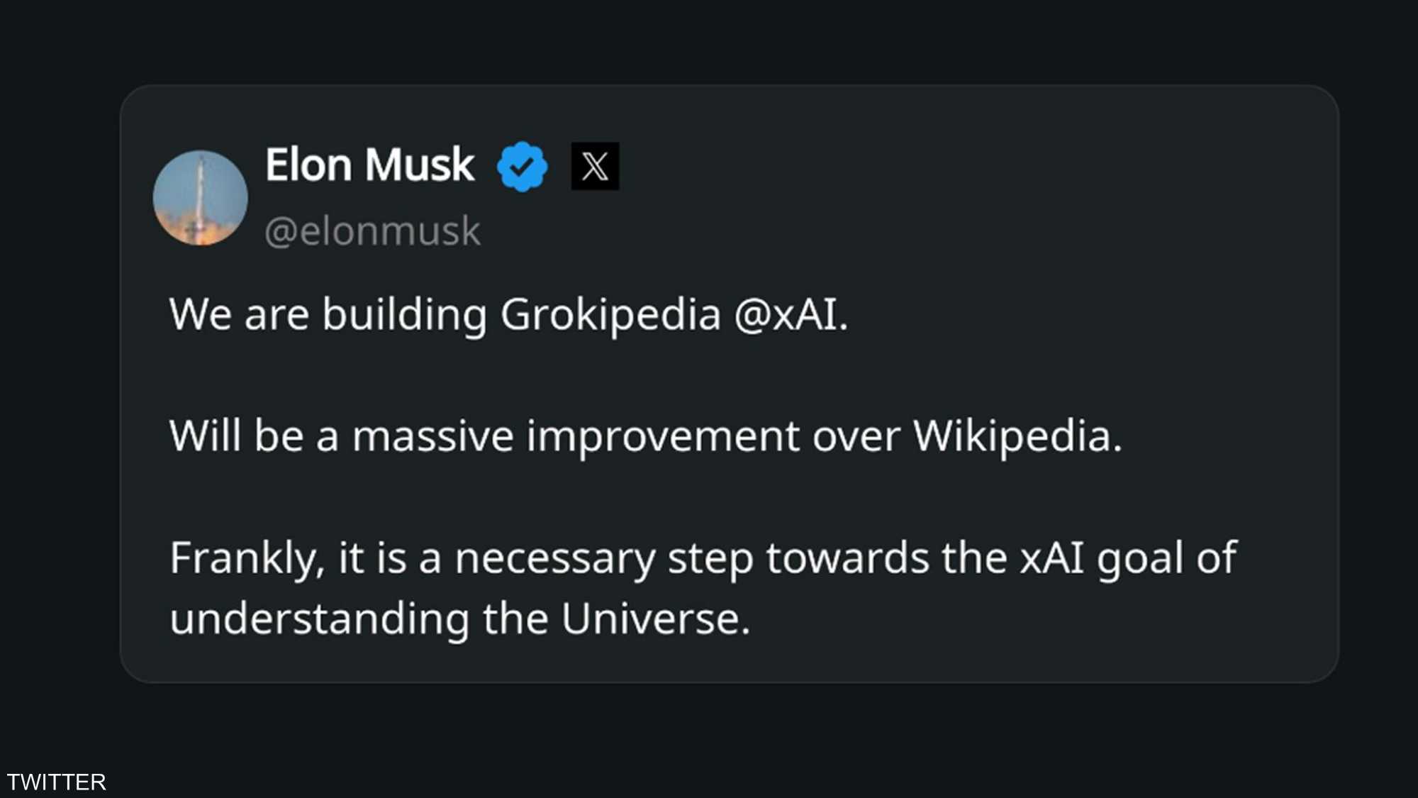 أعلن الملياردير ورجل الأعمال الأمريكي إيلون ماسك، مالك منصة «إكس» ورئيس شركة الذكاء الاصطناعي «إكس.أيه.أي»، عن خطط لإطلاق منصة جديدة تحمل اسم «غروكيبيديا»، لتكون منافسًا مباشرًا للموسوعة العالمية «ويكيبيديا»، مؤكداَ، أن المشروع الجديد سيكون «تحسينا هائلا» مقارنة بالنسخة الحالية التي تعتمد منذ سنوات على متطوعين في إدخال وتحرير المحتوى.