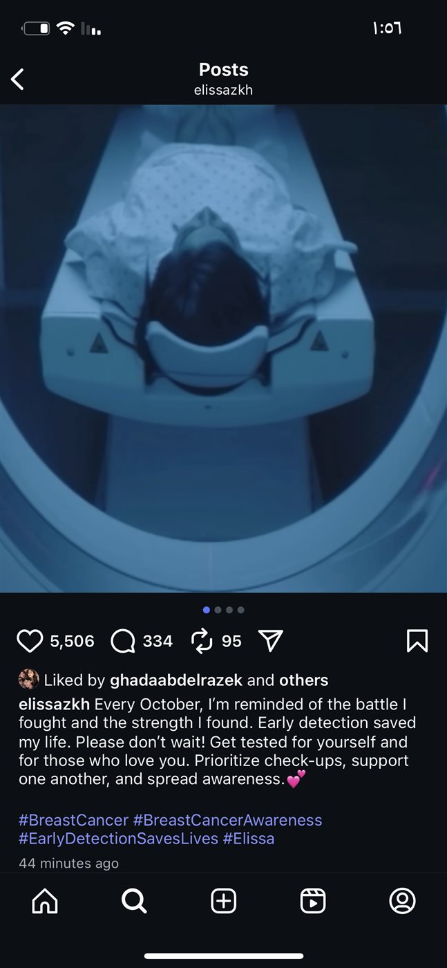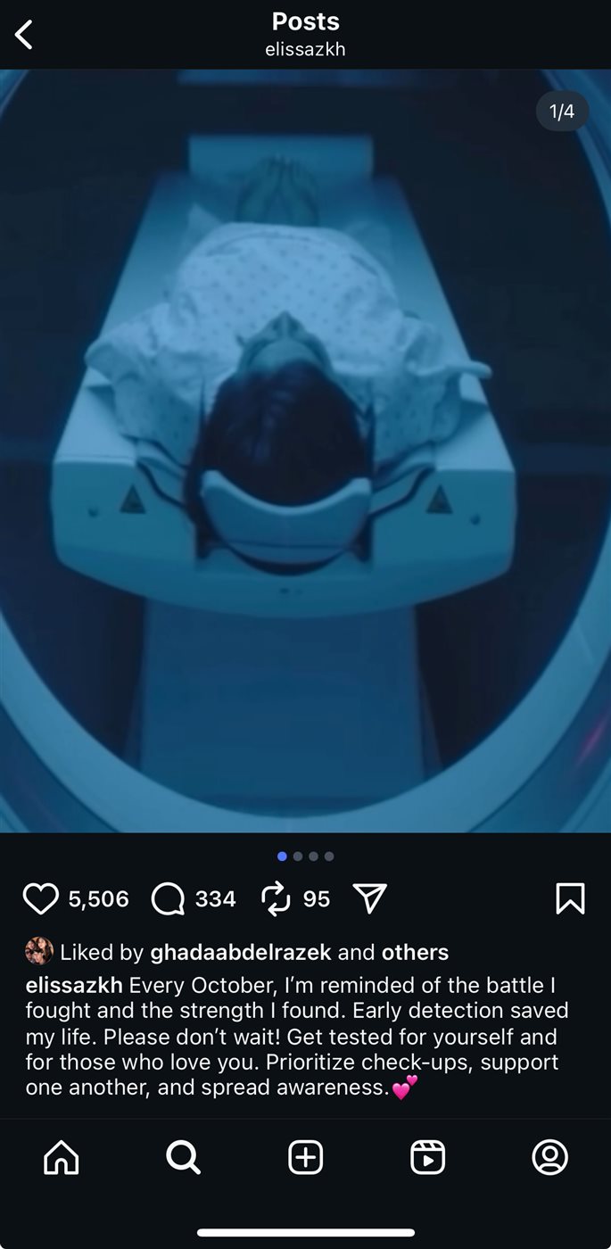 وقالت إليسا عبر حسابها الشخصي على موقع تبادل الصور والفيديوهات إنستجرام: أتذكر المعركة التي خضتها والقوة التي وجدتها في داخلي. الكشف المبكر أنقذ حياتي. من فضلك، لا تنتظر! افحص نفسك من أجل نفسك ومن أجل من يحبونك. اجعل الفحوصات أولوية، وادعم الآخرين، وانشر الوعي.