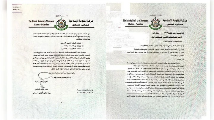 كانت أولى الوثائق الرسمية التي نشرتها إسرائيل وترجمتها رسالة من عام 2021، ويُزعم أنها من إسماعيل هنية، الذي شغل منصب رئيس المكتب السياسي لحماس حتى اغتياله في عام 2024.