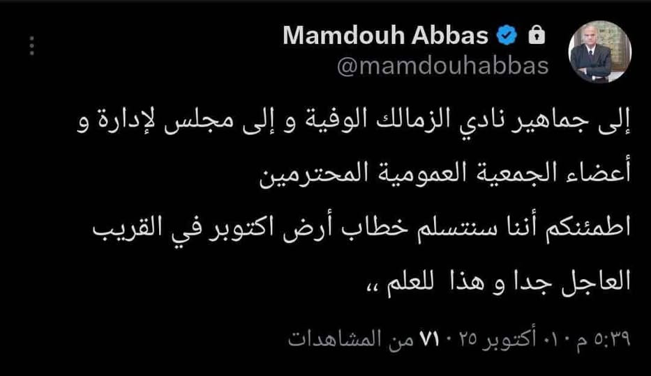 وكتب ممدوح عباس عبر حسابه الرسمي على منصة "إكس"، قائلًا: "إلى جماهير نادي الزمالك الوفية وإلى مجلس لإدارة وأعضاء الجمعية العمومية المحترمين، أطمئنكم أننا سنستلم خطاب أرض أكتوبر في القريب العاجل جدا وهذا للعلم".