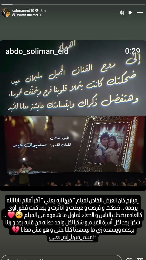 وأضاف عبد الرحمن سليمان عيد: "ظهور خاص، الفنان القدير: سليمان عيد إمبارح كان العرض الخاص لفيلم " فيها إيه يعني “ آخر أفلام بابا الله يرحمه .. ضحكت وفرحت وعيطت واتأثرت وبجد كنت فخور، أوي كالعادة بضحك الناس والدعاء له أول ما شافوه في الفيلم شكرًا، بجد لكل أسرة الفيلم”.