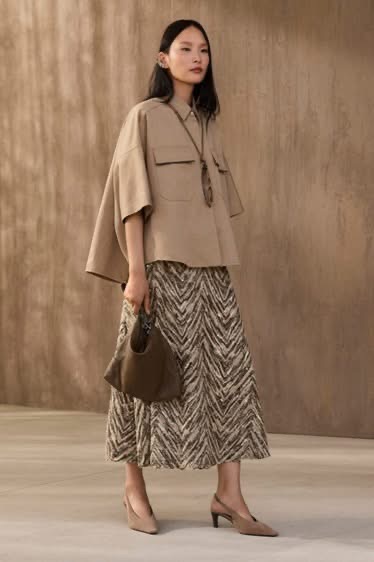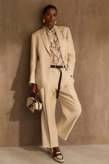 الأرض سيطرت على لوحة الألوان، حيث انعكس ذلك في درجات الرمال والطين والإكرُو الدافئة، مع أنسجة خفيفة من التويد ونقوش الشيفرون الكبيرة التي حملت توقيع الخياطة الإيطالية التقليدية، لكنها مُعادة تفسيرها بروح صيفية خفيفة.