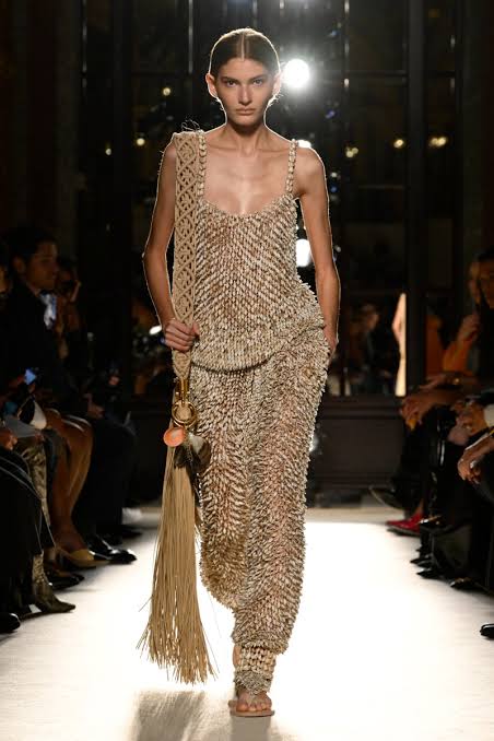 لاحقًا، ظهر فستان، كشفت عنه منشفة مربوطة ببساطة حول الخصر. في الوقت نفسه، استذكرت القمصان التقنية المستخدمة في فستان الرمال الرائع الذي ارتدته المغنية تايلا في حفل ميت غالا 2024. أعطى التصميم انطباعًا بطبقة رقيقة من الغبار الذهبي تتدلى برقة على الكتفين. مجموعة بالمان بلمسات بوهيمية.