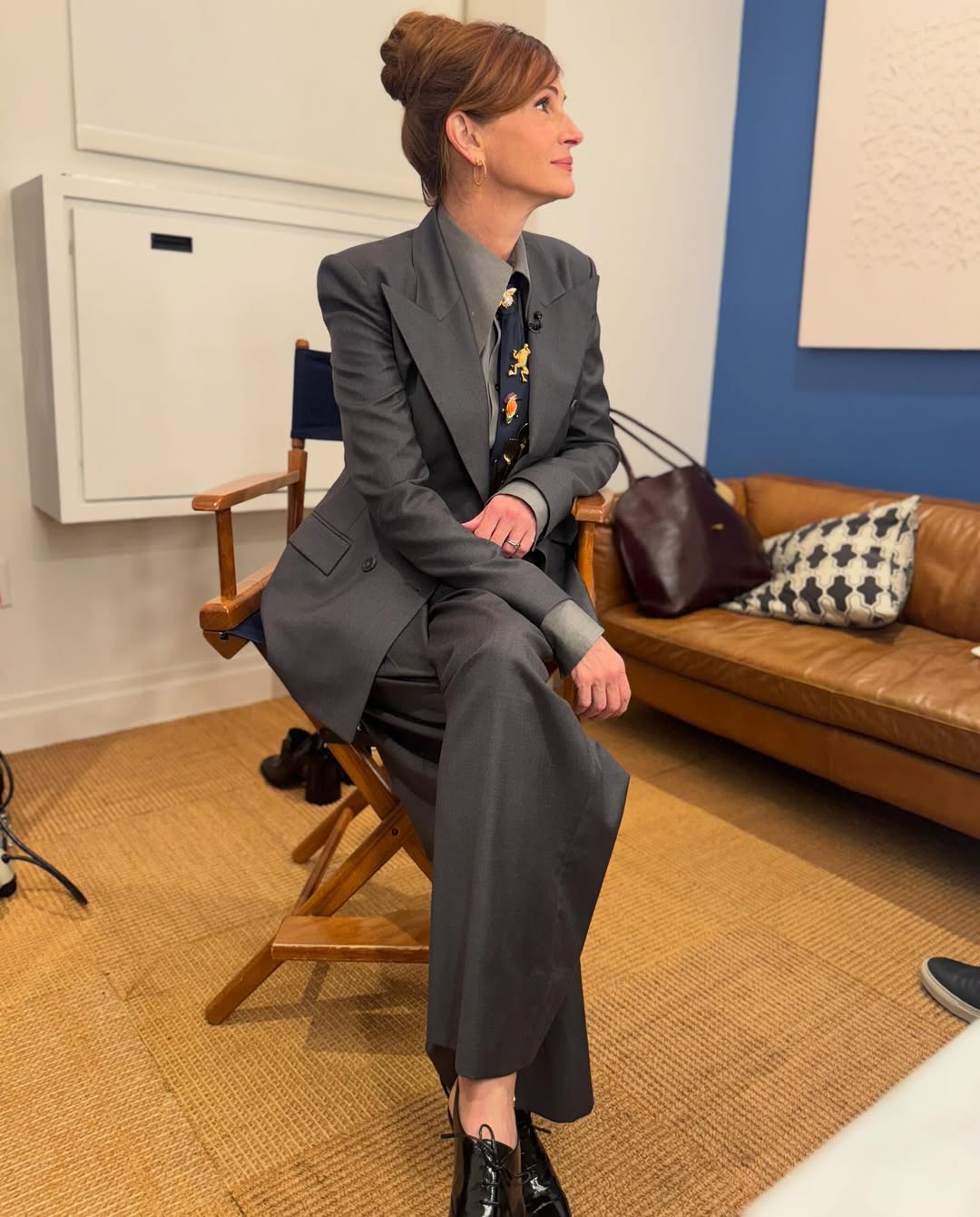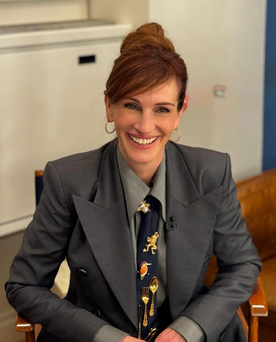 جاءت إطلالة روبرتس الحالية بالبدلة الرمادية أكثر ملاءمة للجسم مقارنة بالتصميم الأصلي الفضفاض، مع سترة مزدوجة الصدر وتصميم الوسادات كتف الحادة، واختارت إضافة ربطة عنق مزينة بعدة دبابيس ذهبية لتعكس أجواء السجادة الحمراء.