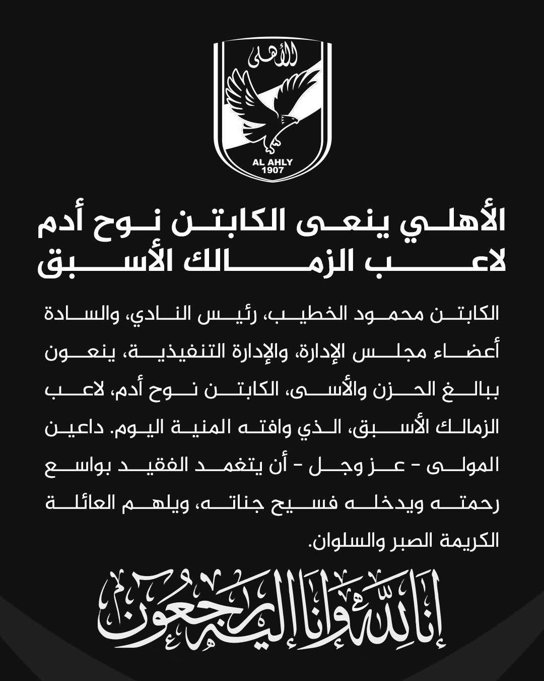 نعى نادي الأهلي برئاسة الكباتن محمود الخطيب، عبر حسابه الرسمي على فيسبوك، الكابتن نوح اأدم نجم نادي الزمالك السابق الذي وافته المنية اليوم.