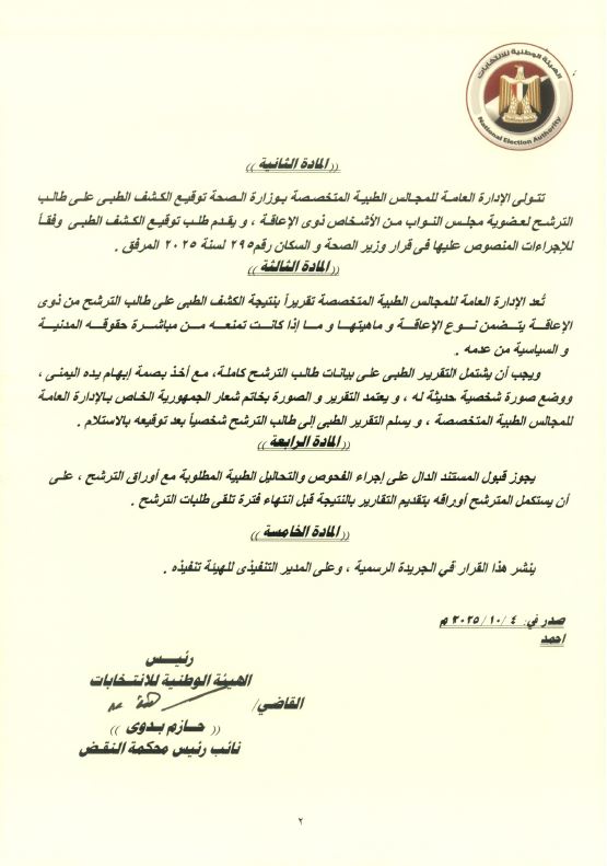 ونص القرار فى مادته الثانية على ان تتولى الادارة العامة للمجالس الطبية المتخصص بوزارة الصحة توقيع الكشف الطبى على طالب الترشح لعضوية مجلس النواب من الأشخاص ذوى الاعاقة، ويقدم طلب توقيع الكشف الطبى وفقا للاجراءات المنصوص عليها فى قرار وزارة الصحة والسكان رقم 295 لسنة 2025.
