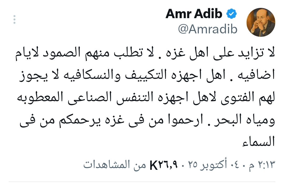 وكتب أديب عبر حسابه الرسمي على منصة إكس: لا تزايد على أهل غزة، لا تطلب منهم الصمود لأيام إضافية، أهل أجهزة التكييف والنسكافيهة لا يجوز لهم الفتوى لأهل أجهزة التنفس الصناعى المعطوبهة ومياه البحر، ارحموا من فى غزة يرحمكم من فى السماء.