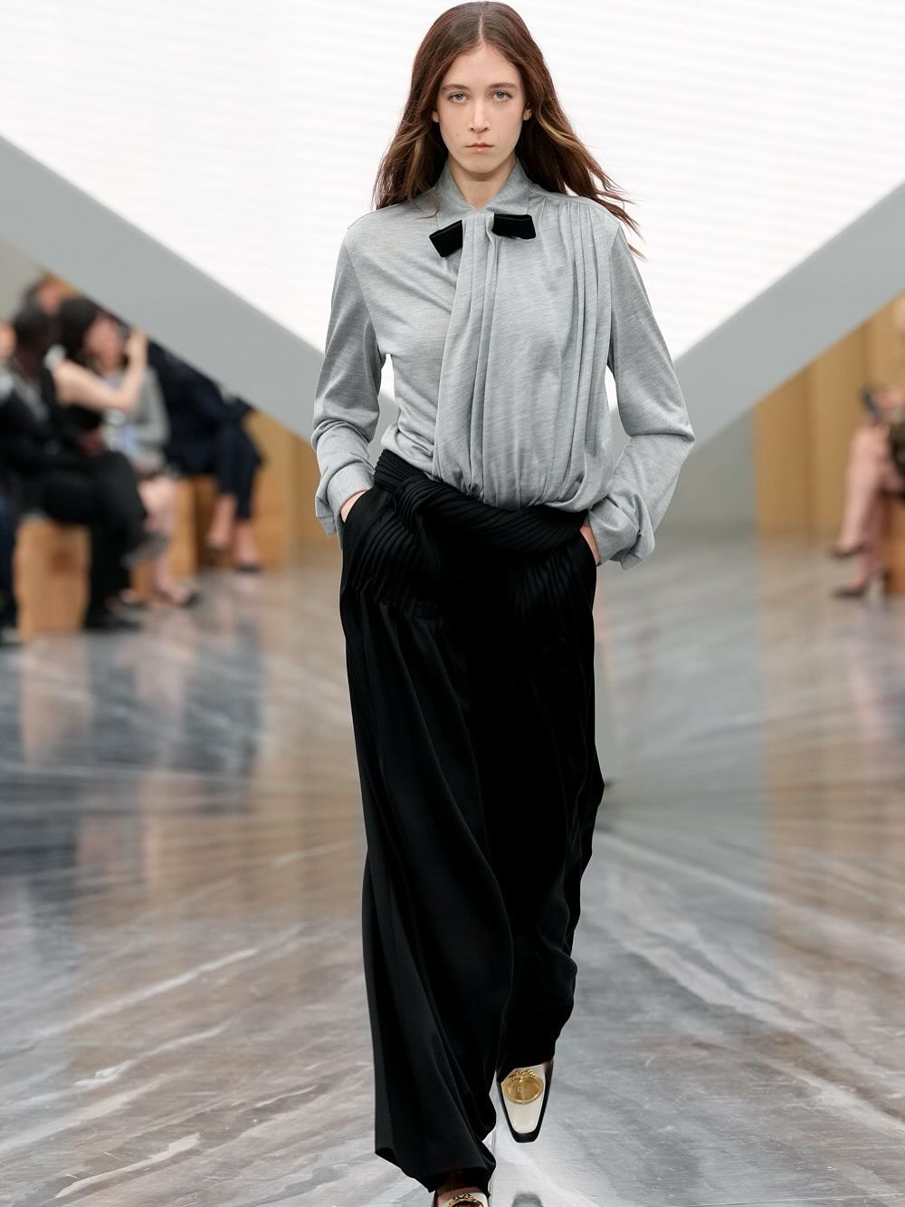 ارتدت صنداى إطلالة أنيقة تألفت من قميص رمادي واسع بياقة كلاسيكية مع ربطة سوداء غير تقليدية، وسروال أسود بتفاصيل مطوية بعناية، واكتملت الإطلالة بحذاء ثنائي اللون يزيّنه شعار ديور الذهبي. إطلالة عصرية عزّزت حضورها بين نخبة العارضات الللواتي شكّلن الحدث في العرض الذي حضرته شخصيات بارزة مثل السيدة الفرنسية الأولى بريجيت ماكرون والنجم جوني ديب.