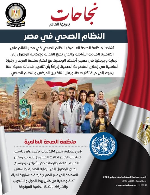 أشادت منظمة الصحة العالمية بالنظام الصحي في مصر واعتبار سلامة المرضى ركيزة أساسية في إصلاح المنظومة الصحية، من خلال مبادرة «المستشفيات الصديقة لسلامة المرضى»، التي أطلقتها وزارة الصحة والسكان بدعم من المنظمة، وقد تم اختيار ثلاث مستشفيات؛ لتكون نماذج إقليمية.