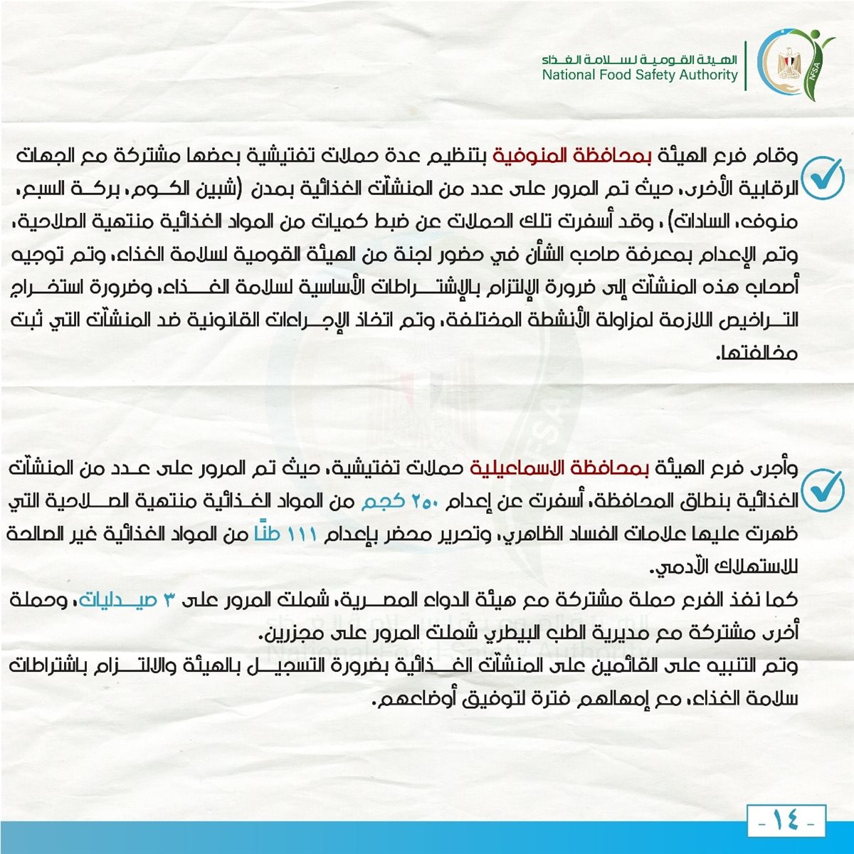 وقام فرع الهيئة بمحافظة المنوفية بتنظيم عدة حملات تفتيشية بعضها مشتركة مع الجهات الرقابية الأخرى، حيث تم المرور على عدد من المنشآت الغذائية بمدن (شبين الكوم، بركة السبع، منوف، السادات)، وقد أسفرت تلك الحملات عن ضبط كميات من المواد الغذائية منتهية الصلاحية، وتم الإعدام بمعرفة صاحب الشأن في حضور لجنة من الهيئة القومية لسلامة الغذاء، وتم توجيه أصحاب هذه المنشآت إلى ضرورة الإلتزام بالإشتراطات الأساسية لسلامة الغذاء، وضرورة استخراج التراخيص اللازمة لمزاولة الأنشطة المختلفة ، وتم اتخاذ الإجراءات القانونية ضد المنشآت التي ثبت مخالفتها.