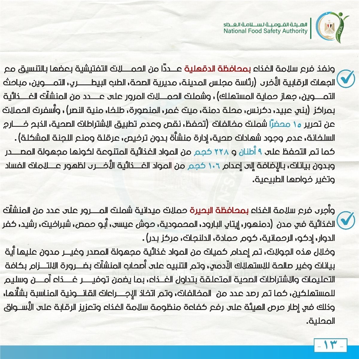 وأجرى فرع سلامة الغذاء بمحافظة البحيرة حملات ميدانية شملت المرور على عدد من المنشآت الغذائية في مدن (دمنهور، إيتاي البارود، المحمودية، حوش عيسى، أبو حمص، شبراخيت، رشيد، كفر الدوار، إدكو، الرحمانية، كوم حمادة، الدلنجات، مركز بدر).