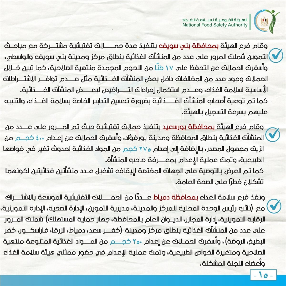 وقام فرع الهيئة بمحافظة بني سويف بتنفيذ عدة حملات تفتيشية مشتركة مع مباحث التموين شملت المرور على عدد من المنشآت الغذائية بنطاق مركز ومدينة بني سويف والواسطي، وأسفرت الحملات عن التحفظ على 17 طنًا من اللحوم المجمدة منتهية الصلاحية، كما تبين خلال الحملات وجود عدد من المخالفات داخل بعض المنشآت الغذائية مثل عدم توافر الاشتراطات الأساسية لسلامة الغذاء، وعدم استكمال إجراءات التراخيص لبعض المنشآت الغذائية.