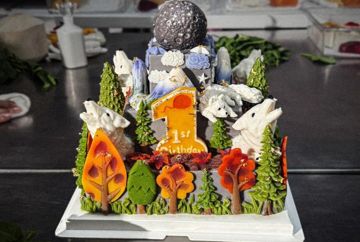 كما هو موضح في البيان الصحفي، تمت الموافقة على جميع المكونات بعناية من قبل فريق تربية الحيوانات في كولوسال، وزُيّنت الكعكة بجبال وأشجار، وحتى قمر، وتوجت بذئاب منحوتة.