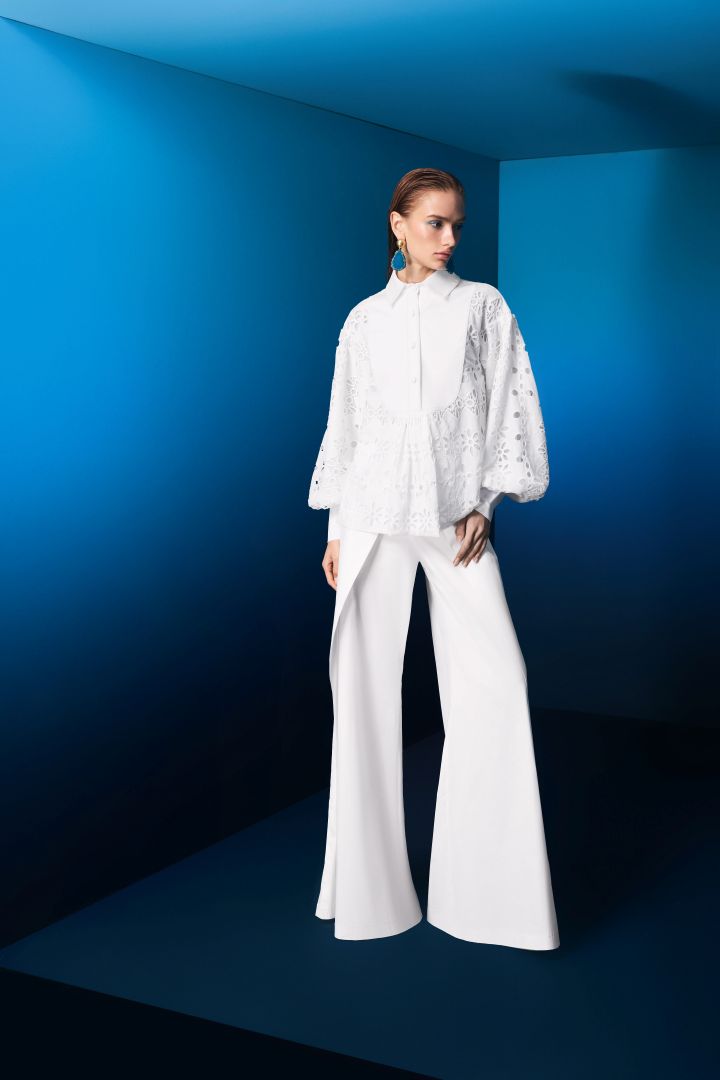 كما لفتنا فستان مصنوع من الكروشيه من القطن باللون الأخضر المائي، يتميز بتنورة متدفقة على شكل حرف A، وفتحة عنق جريئة على شكل حرف سبعة عميقة، وأكمام ربعية ناعمة، وتم تثبيت حزام معدني فضي يضيء الخصر بلمسة من الرقي. وثمة آخر هو عبارة عن بلوزة كروشيه من القطن باللون الأبيض بأكمام منفوخة وياقة على الطراز الفيكتوري، مع بنطلون واسع متناسق.