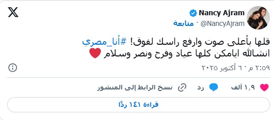 وكتبت نانسي عجرم عبر حسابها على "إكس": «قلها بأعلى صوت وارفع راسك لفوق! أنا مصري.. إن شاء الله ايامكن كلها عياد وفرح ونصر وسلام».