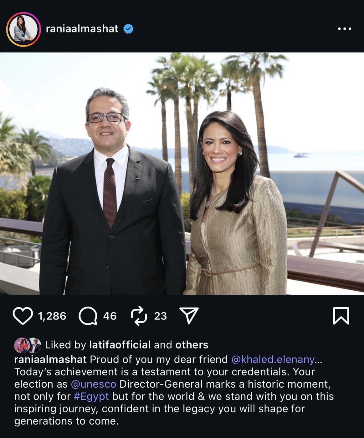 وقالت المشاط في تدوينة له عبر حسابها على انستجرام : “ أهني صديقي العزيز د. خالد عناني، بفوزه برئاسة منظمة اليونسكو”.