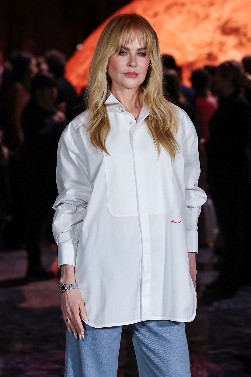 في عرض شانيل، ظهرت نيكول كيدمان بتسريحة شعر جديدة تتميز بغرة ناعمة تُحيط بالوجه، وارتدت قميصًا أبيض واسعًا أنيقًا بأزرار مع بنطال جينز واسع الساقين، مع إكسسوارات بسيطة ومكياج.