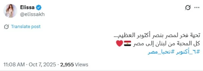 حرصت المطربة اللبنانية إليسا على الاحتفال بذكرى حرب أكتوبر، حيث نشرت تويتة على موقع إكس، ووجهت من خلالها رسالة إلي الجمهور قائلة: "تحية فخر لمصر بنصر أكتوبر العظيم، كل المحبة من لبنان إلى مصر".