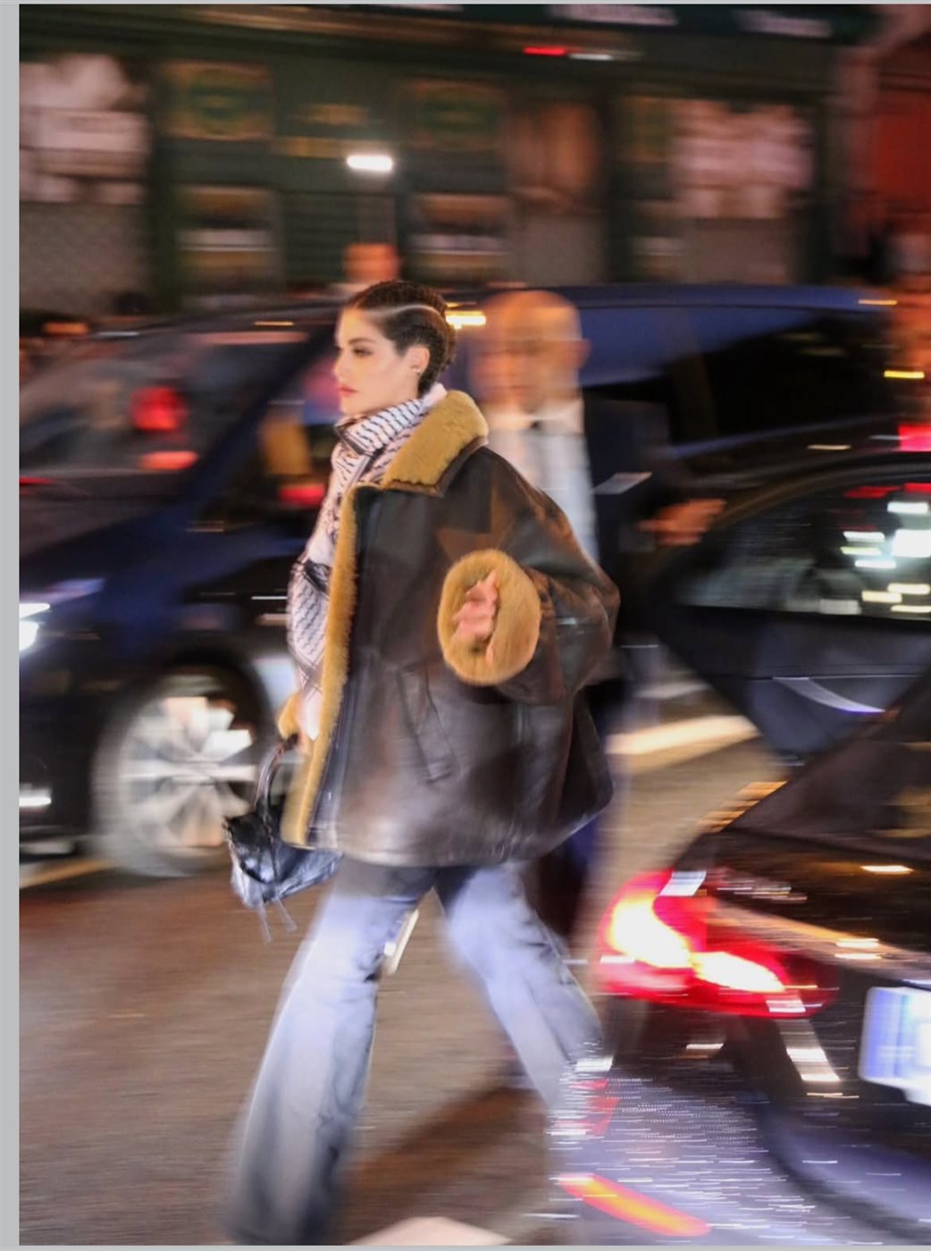 في اليوم التالي، ظهرت بإطلالة مختلفة خلال عرض دار "سيلين"، حيث ارتدت جاكيت بلايزر سوداء كلاسيكية فوق قميص أبيض اللون، مع سروال جينز، وحزام أسود، وحقيبة سوداء كبيرة. واعتمدت تسريحة شعر قصيرة مع مكياج ناعم، سموكي خفيف على العيون، وأحمر شفاه زهري.