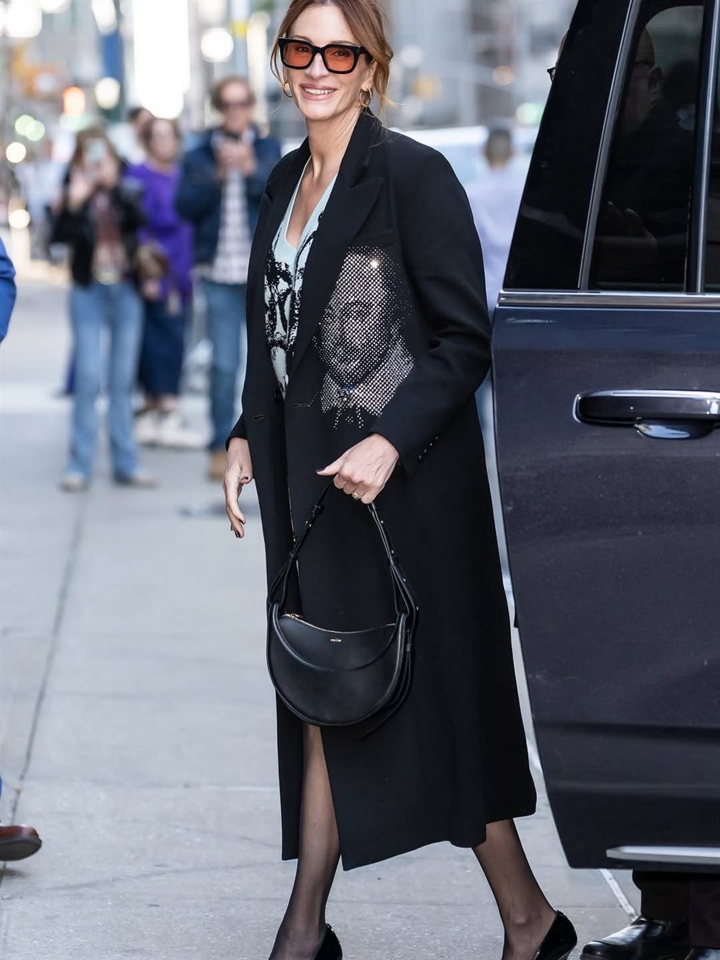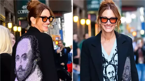 وقد ارتدت النجمة العالمية جوليا روبرتس، البالغة من العمر 57 عاماً، معطفاً أسودَ مُزيناً بصورة للشاعر الإنجليزي ويليام شكسبير خلال تجوالها في مدينة نيويورك أمس الأربعاء.