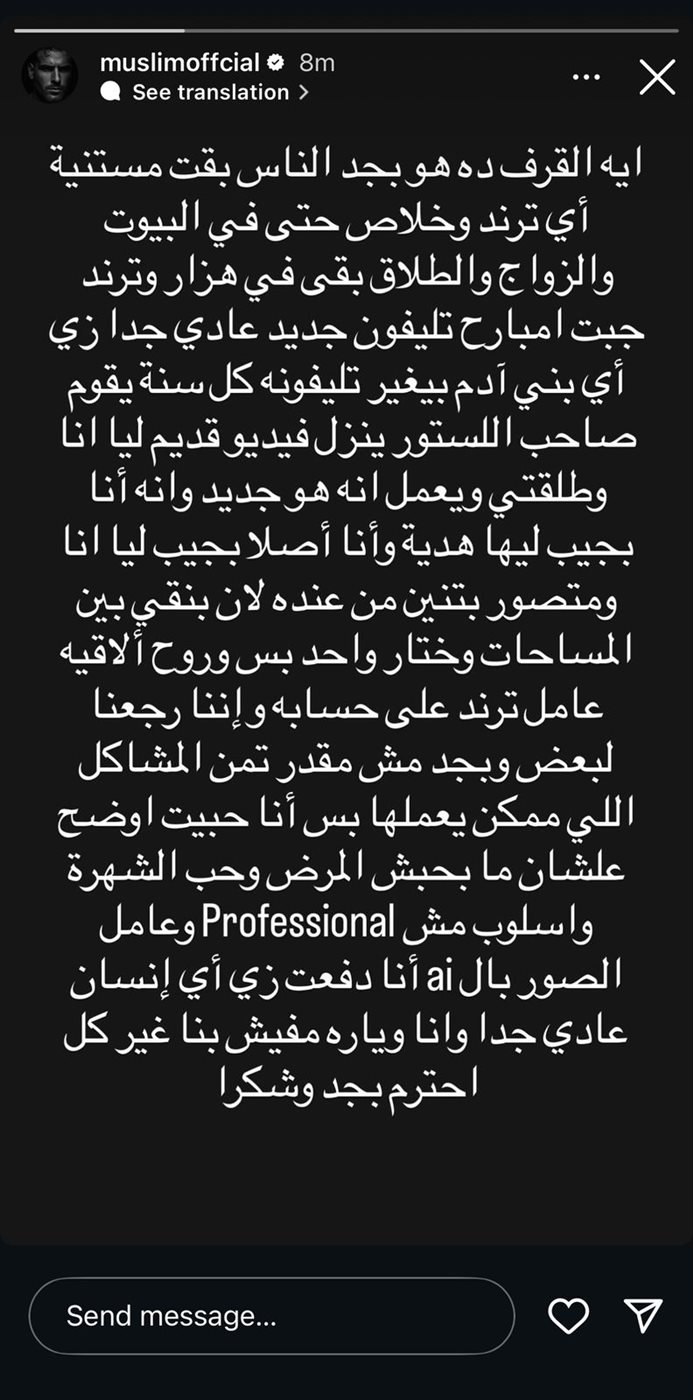 وكتب مسلم عبر صفحته الرسمية على موقع التواصل الاجتماعي إنستجرام : إيه القرف ده هو بجد الناس بقت مستنية أي ترند وخلاص حتى في البيوت والزواج والطلاق بقى في هزار وترند .. جبت امبارح تليفون جديد عادي جدا زي أي بني آدم بيغير تليفونه كل سنة .