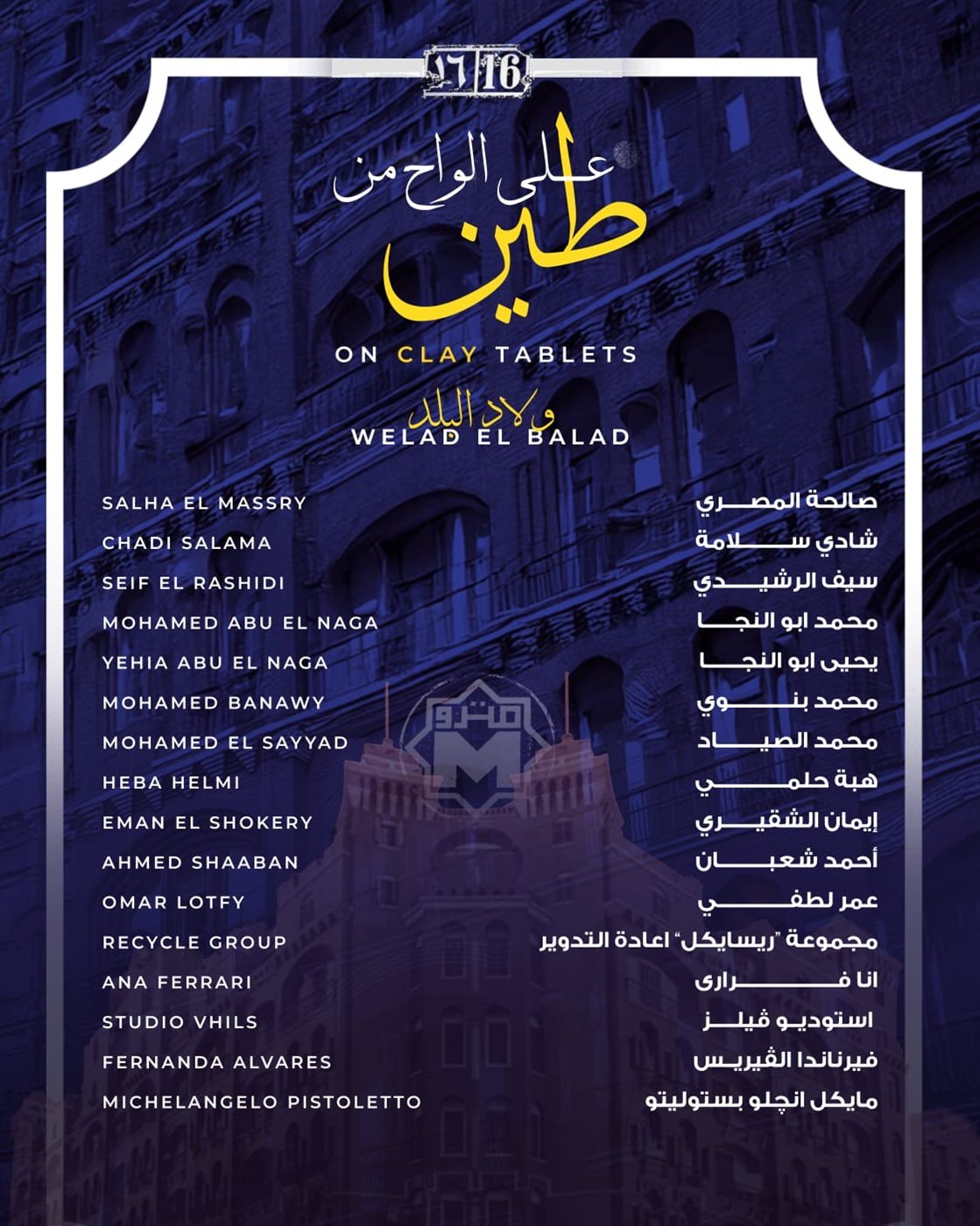 ● علي الواح من طين : مستوحى من تطور الإنسانية من الحكايات الشفوية إلى الذاكرة المكتوبة، محوِّلاً الأصوات الزائلة إلى إرث حضاري دائم. يشارك فيه الفنان الإيطالي الأسطوري ميكيلانجيلو بيستوليتو، أحد رواد حركة "آرته بوفيرا"، إلى جانب المجموعة الفرنسية-الروسية ريسايكل غروب، والفنانة البرازيلية آنا فيراري، والفنان البرتغالي ألكسندر فارتو (فيهلس)، والمصممة الأمريكية أليكس بروبا، بالإضافة إلى عشرة فنانين مصريين.