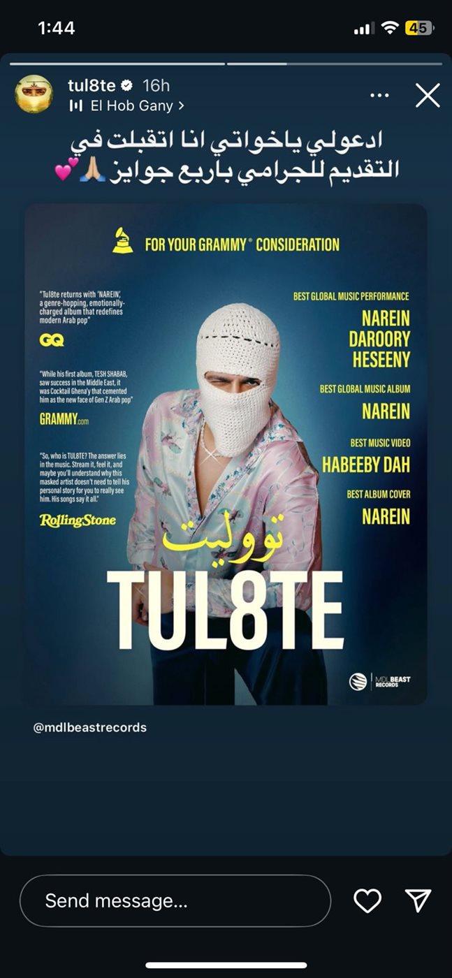 احتفل المطرب الملثم تووليت بقبوله في مسابقة الجرامي ب4 جوائز، عن أغنية نارين، وأغنية ضروري، وأغنية حسيني، وألبوم نارين، وأعلن ذلك من خلال خاصية الأستوري عبر حسابه الرسمي على موقع تبادل الصور والفيديوهات إنستجرام.