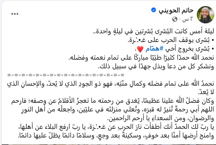 ونشر حاتم الحويني عبر حسابه الرسمي على مواقع التواصل الاجتماعي منشورًا قال فيه: ليلة أمس كانت البُشرى بُشرتين في ليلةٍ واحدة..