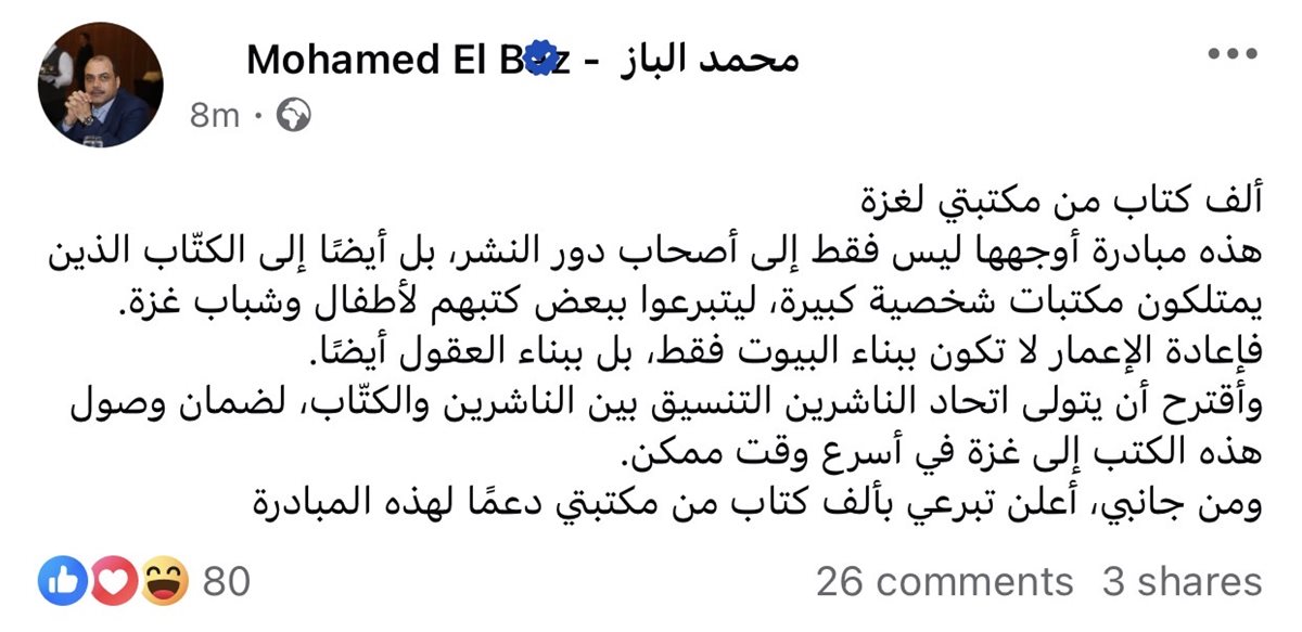 وأوضح الدكتور محمد الباز أن هذه المبادرة لم يوجهها فقط لأصحاب دور النشر، بل أيضًا إلى الكتّاب الذين يمتلكون مكتبات شخصية كبيرة، ليتبرعوا ببعض كتبهم لأطفال وشباب غزة.