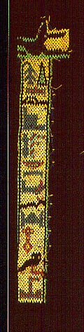 تتألف القطعة من عمود رأسي يحمل نصوصًا هيروغليفية، تعلوه صورة للإله أنوبيس في وضع الاستلقاء، متجهًا نحو اليسار بما يتماشى مع اتجاه الكتابة. صُممت هذه القطعة بدقة متناهية باستخدام خرز أسطواني الشكل متداخل بعناية، ليشكل صفًا من الرموز والعناصر الفنية الدقيقة، فيما لا تزال بعض الخرزات الأصلية المتصلة بالنسيج محفوظة حتى اليوم.