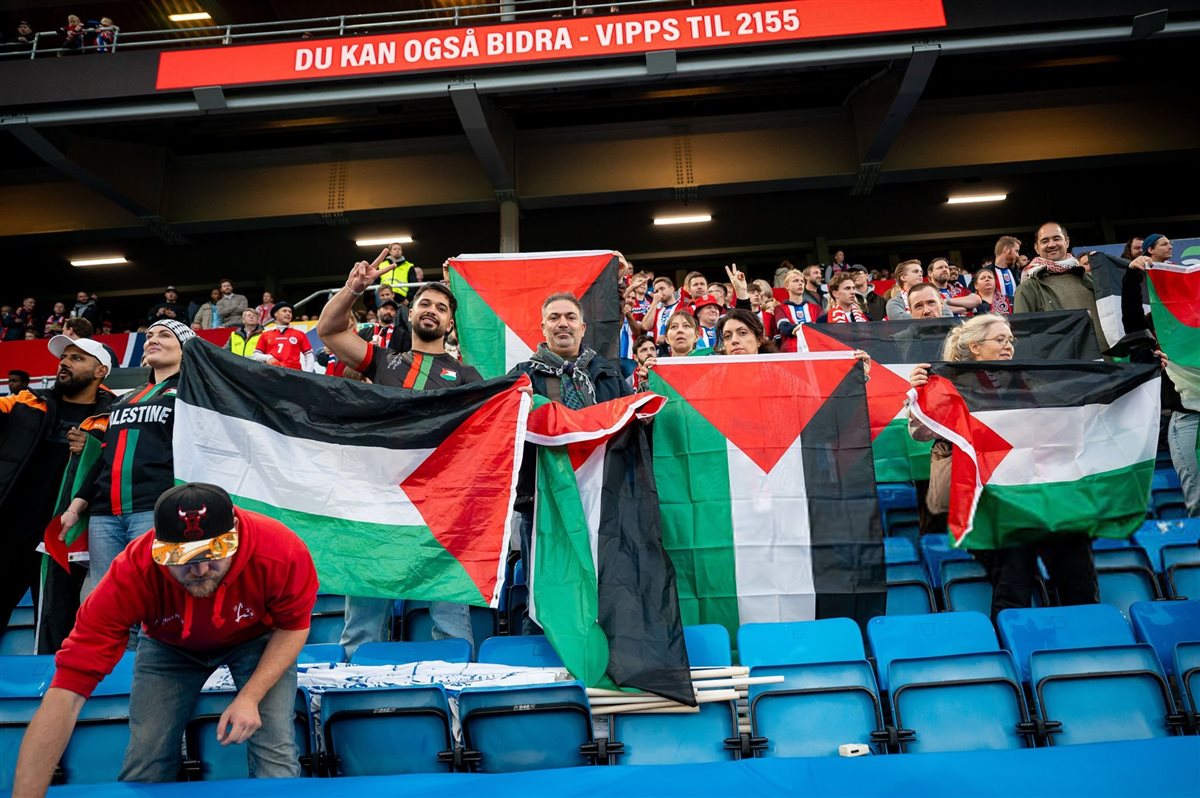 ومع انطلاق صافرة بداية مباراة النرويج وإسرائيل، رفعت الجماهير لافتات تشجب مجازر جيش الاحتلال في قطاع غزة ودعم للقضية الفلسطينية، لتملئ المدرجات بأعلام فلسطين.